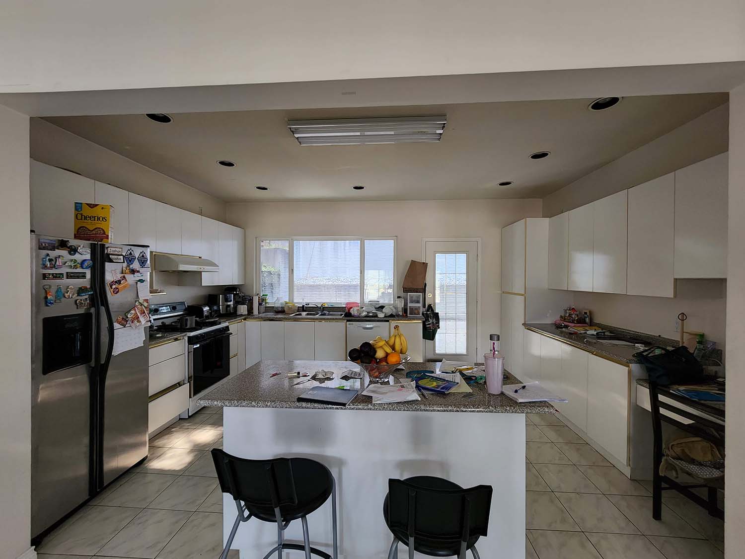 After: The kitchen has been transformed with new, modern white cabinets that provide a bright and open feel. The updated cabinets offer improved storage and a cleaner, more organized look, enhancing the overall functionality and aesthetic of the kitchen.