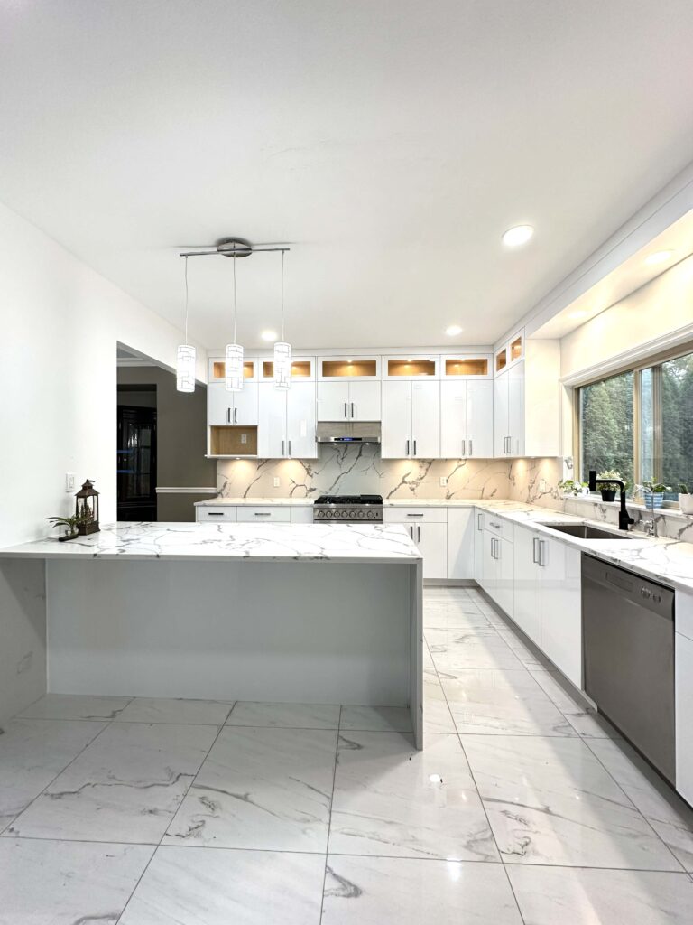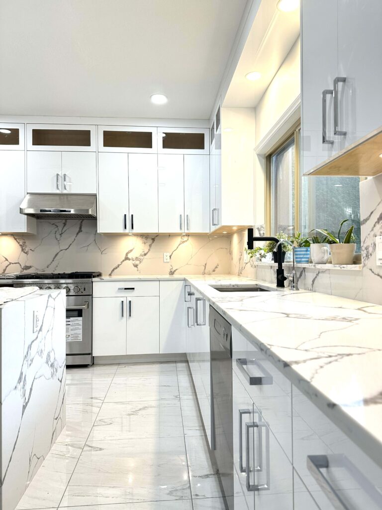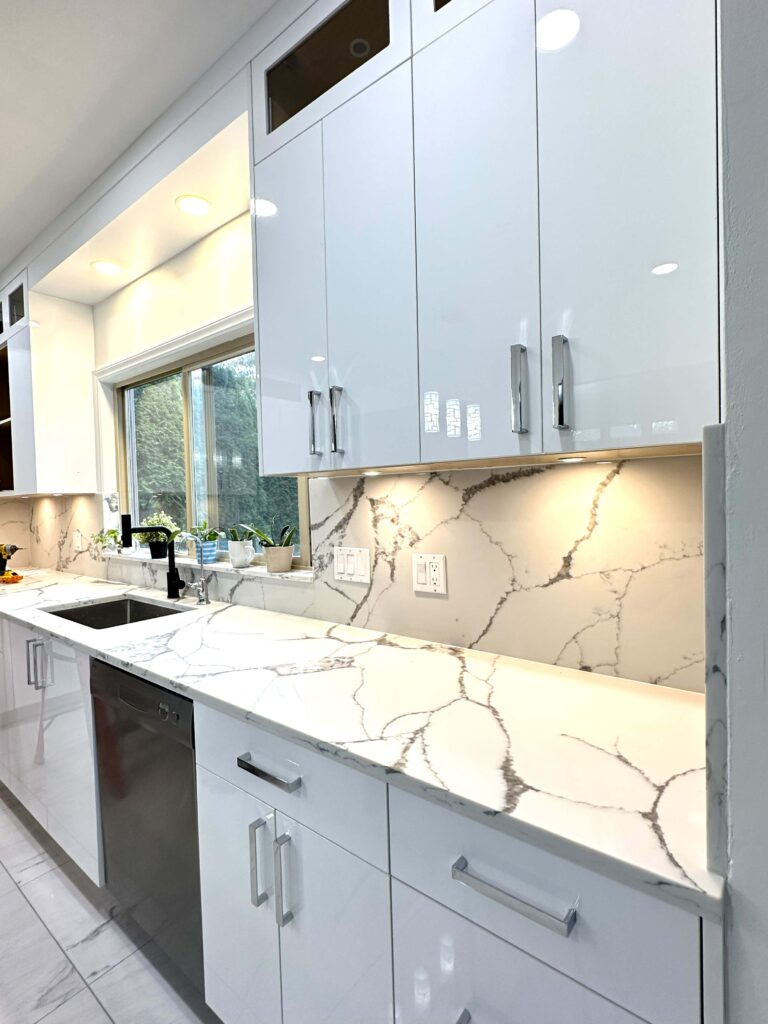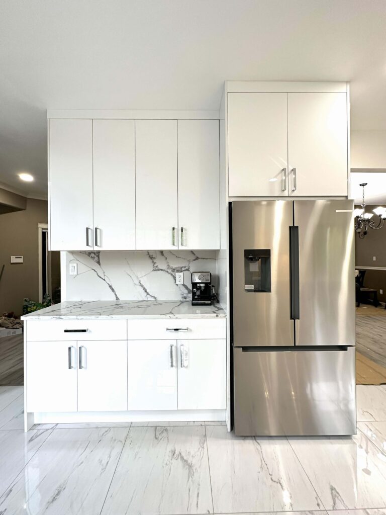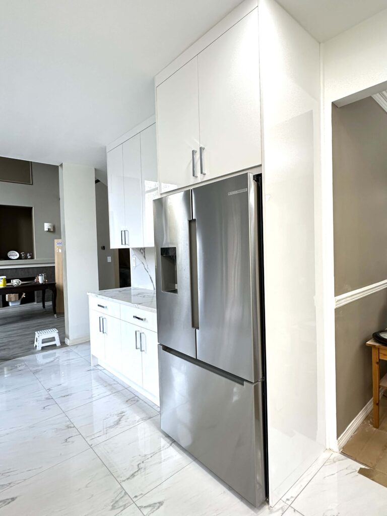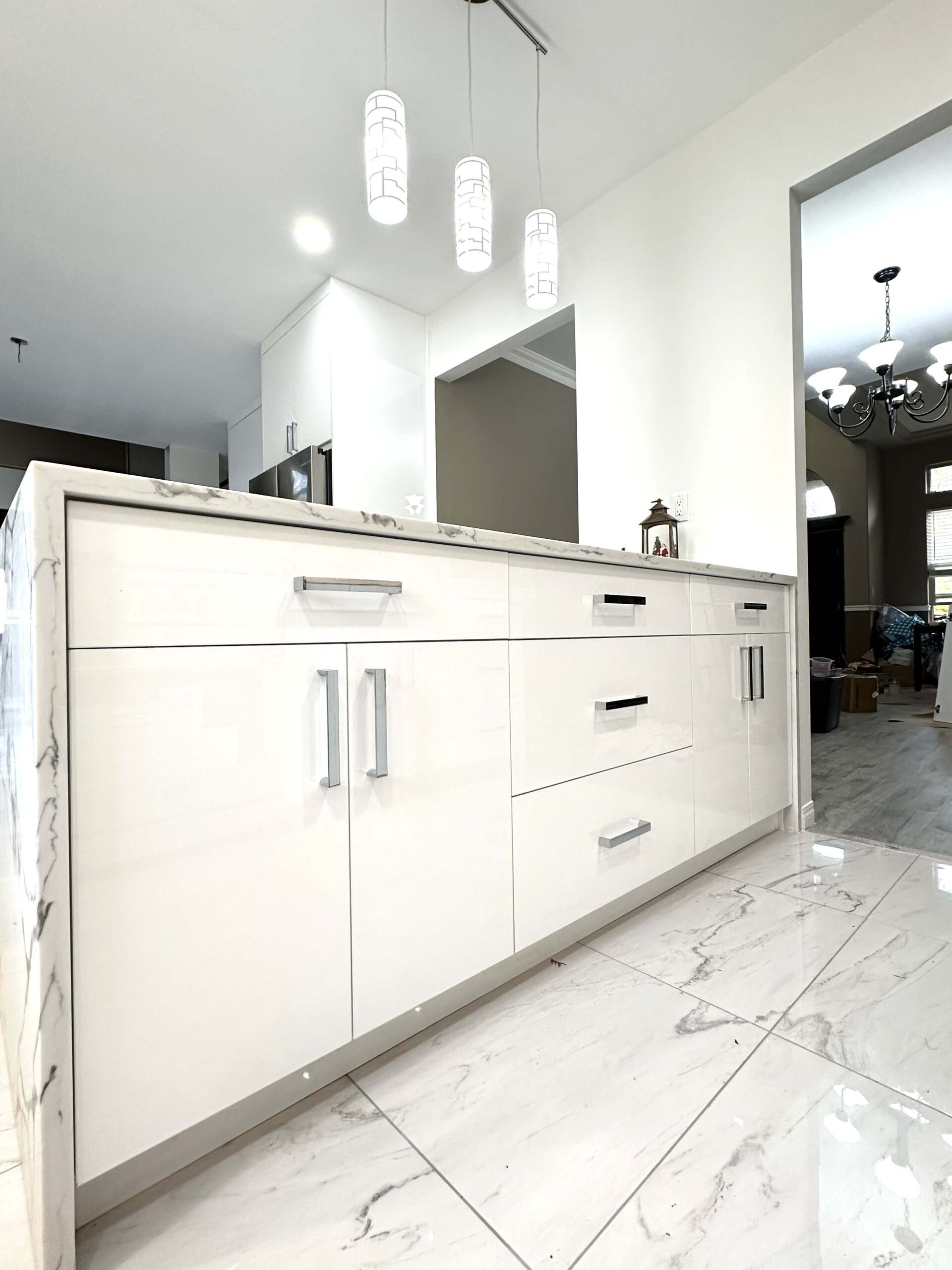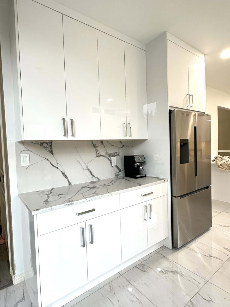 This kitchen cabinet renovation showcases a clean, modern transformation designed for both beauty and everyday functionality. The project features custom white kitchen cabinets, sleek quartz countertops with marble-style veining, and integrated storage solutions that maximize space and flow. Every cabinet was carefully measured, built, and installed to create a seamless, high-end finish.